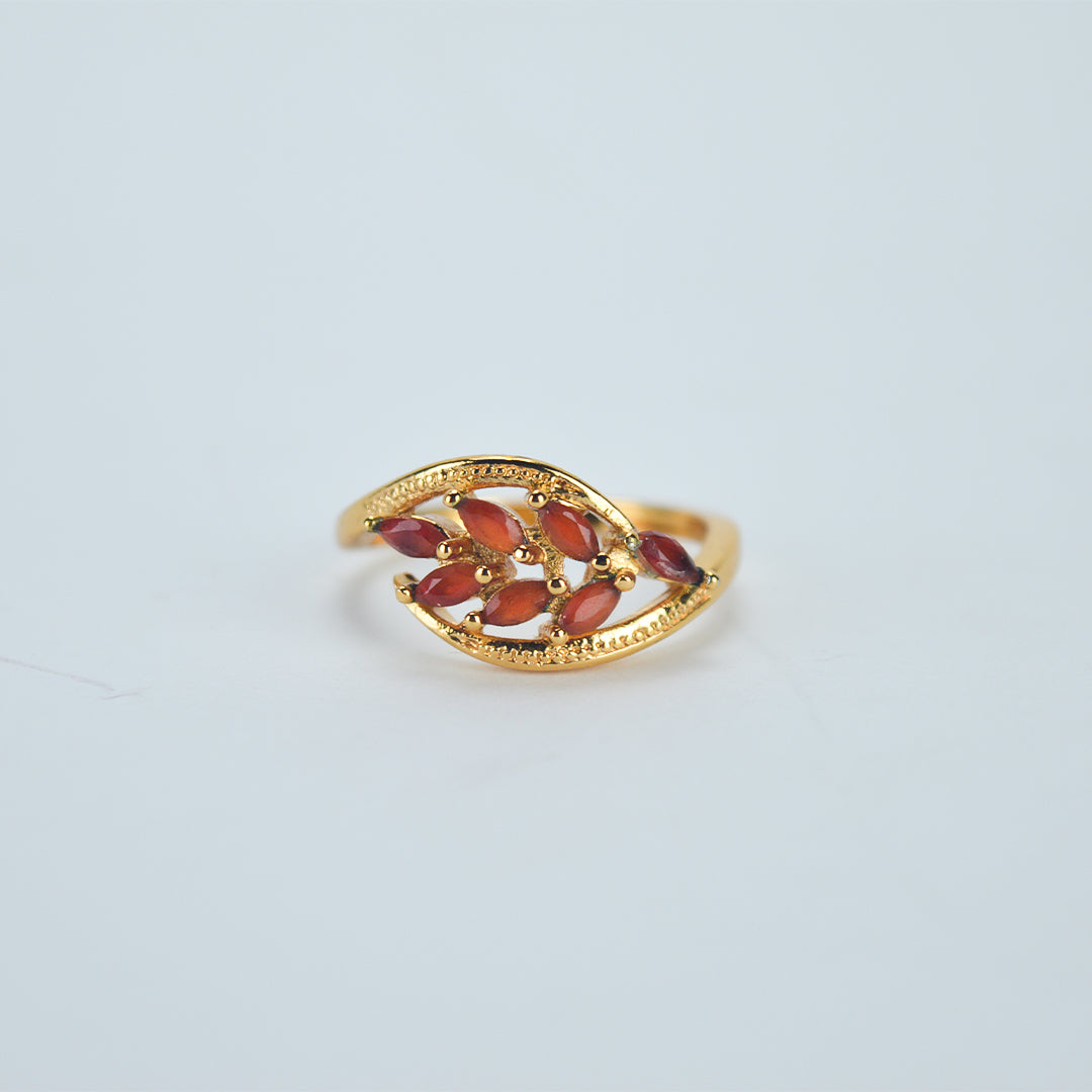 Autumn Bloom is a celebration of natural beauty and timeless craft. Set in polished gold, the band features a stunning textured design inspired by wheat fields — with seven hand-carved, brown-red enamel leaves nestled in a graceful horizontal pattern. Framed by sleek golden lines above and below, this ring captures the spirit of abundance, growth, and quiet strength. A powerful piece for the woman rooted in elegance and purpose.