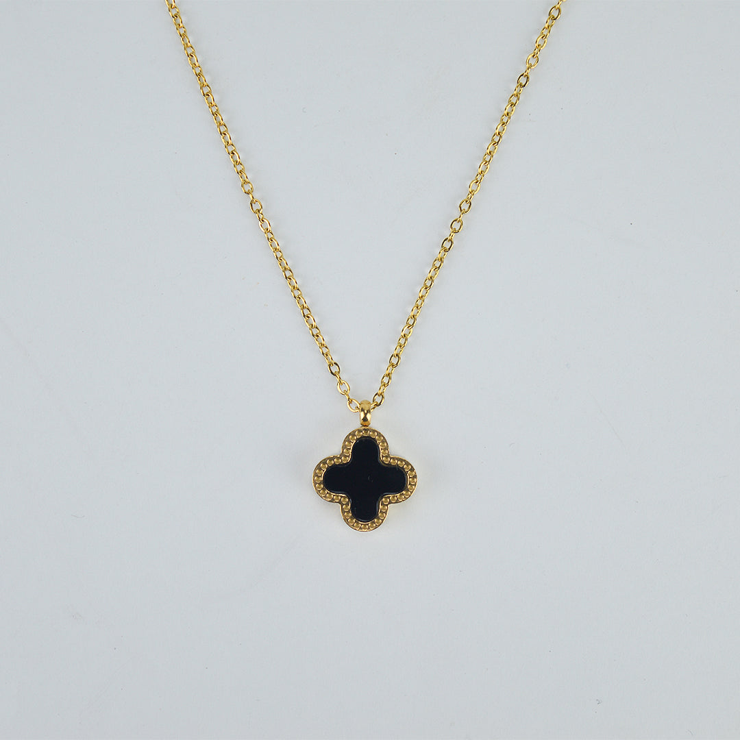 Éclat Noir is the sparkle of mystery — a signature black clover, outlined in glowing gold, suspended delicately from a golden chain. Inspired by the timeless Van Cleef silhouette, this pendant is a tribute to elegance that doesn’t need to speak loudly.