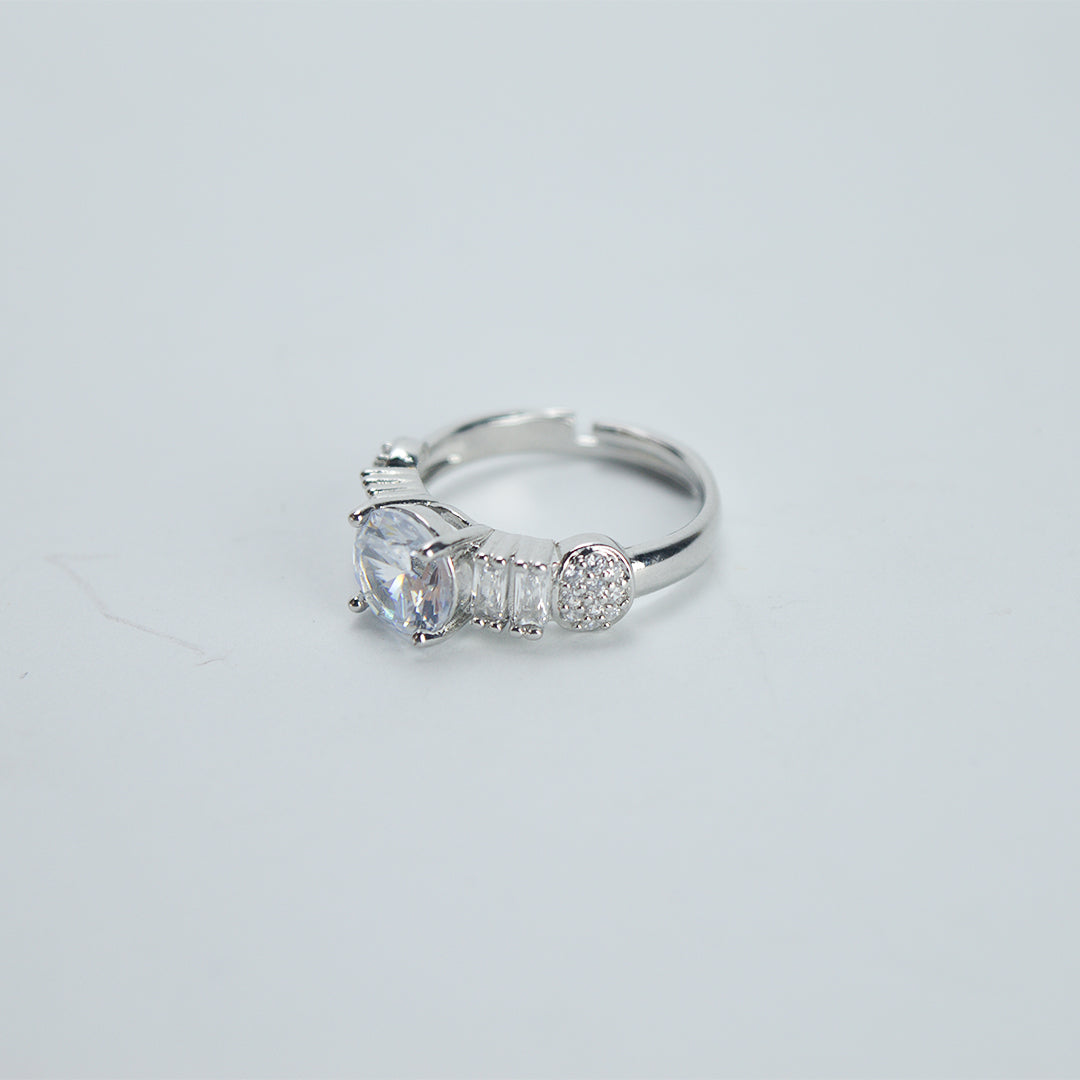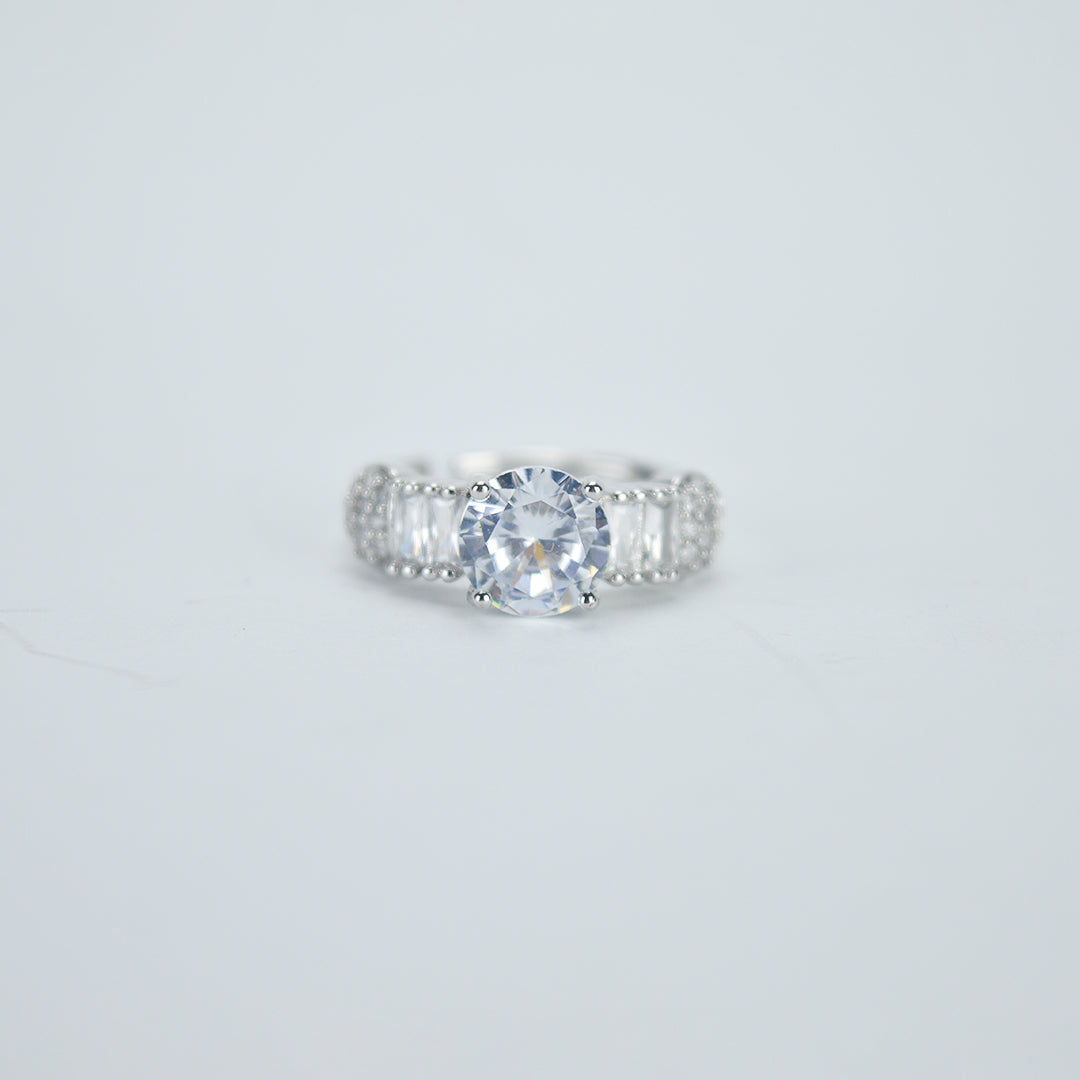 Frosted Aura captures the elegance of winter’s light. At the center rests a luminous round diamond with the faintest whisper of blue — subtle, rare, and breathtaking. Set in sterling silver, the band is adorned with clean, rectangular white stones that cascade halfway around the finger, adding icy brilliance to every angle. This ring is made for the woman who shines quietly — with poise, grace, and a glow all her own.