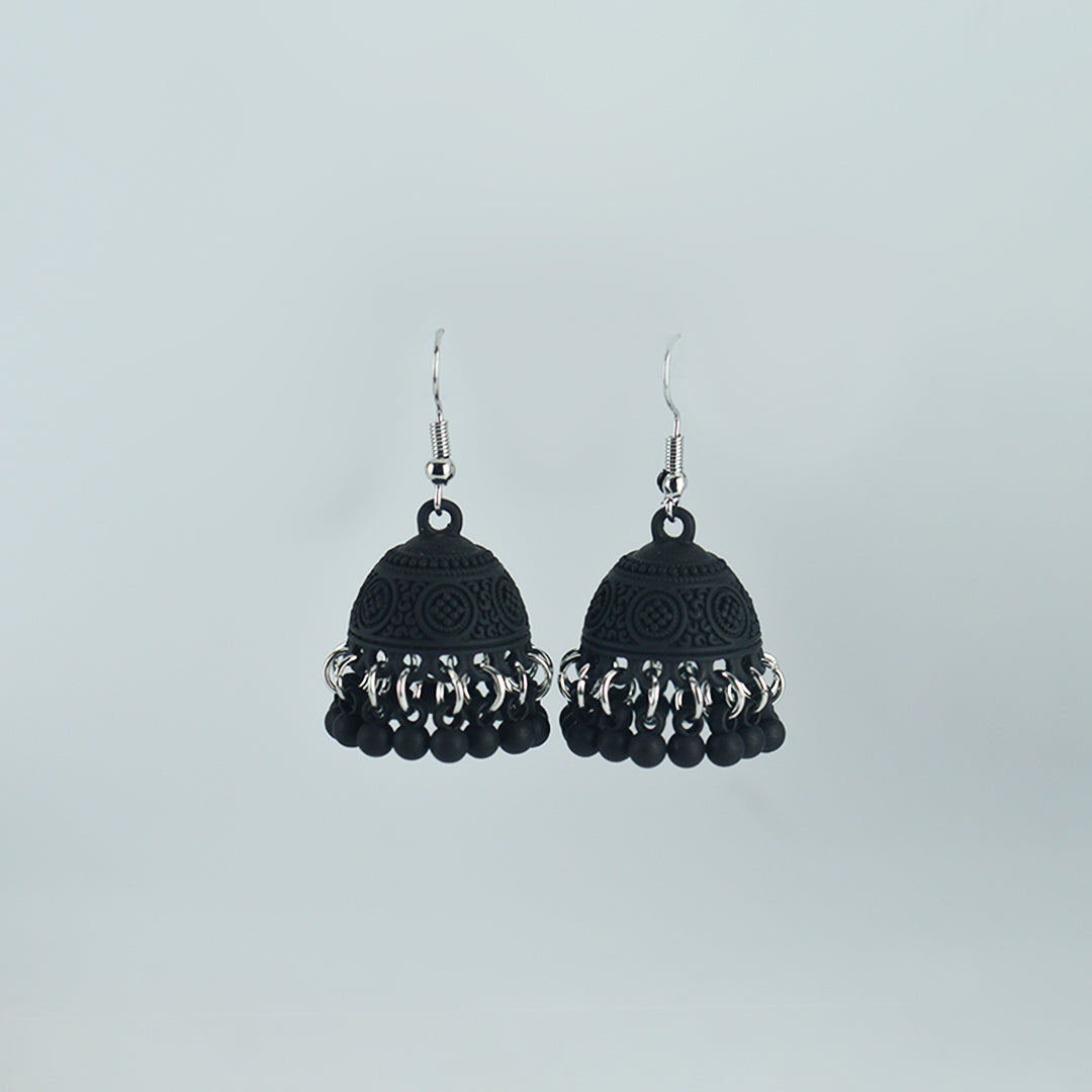 Kaala Mehfil is a graceful tribute to Sindhi elegance. Crafted in full black with intricate traditional motifs, these Jhumkas feature delicate hanging beads and a size that whispers sophistication. Perfect for cultural evenings, festive nights, or adding depth to a minimal look - this piece speaks the language of heritage and timeless beauty.
