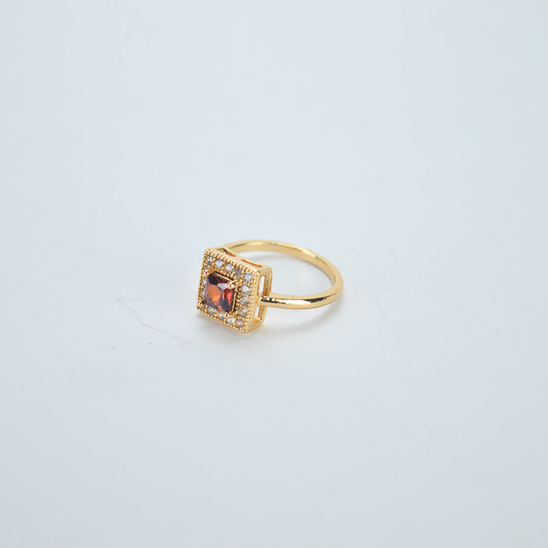Champagne Glint captures the essence of celebration and class. Set in a soft gold band, a striking square-cut gemstone gleams with depth and drama, framed by a delicate halo of radiant crystals. This piece shimmers like a toast under chandelier light — bold, feminine, and undeniably luxe.